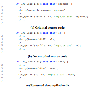 The authors of this paper take advantage of how natural code (code written by people) is highly reptitive and predicatable based on the context. They consider the output of the decompiler to be a noisy distortion of the original source. They use “standard statistical machine translation approaches to choose natural identifiers, combining a translation model trained on a parallel corpus with a language model trained on unmodified C code.” They generate the corpus with 1.2 TB of C source code from GitHub. They estimate that their thing work 16.2% of the time. Their largest issue is that decompilers output code that humans would never write, independent of variable naming. An example of there work is in the below image.